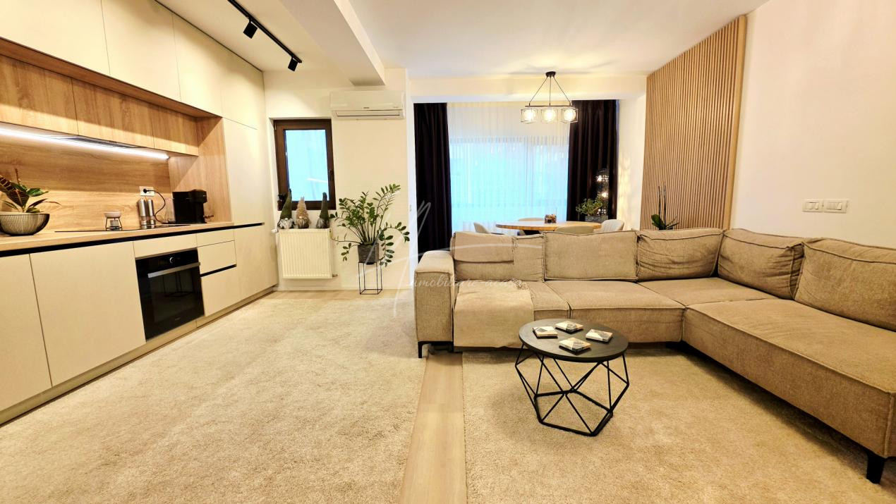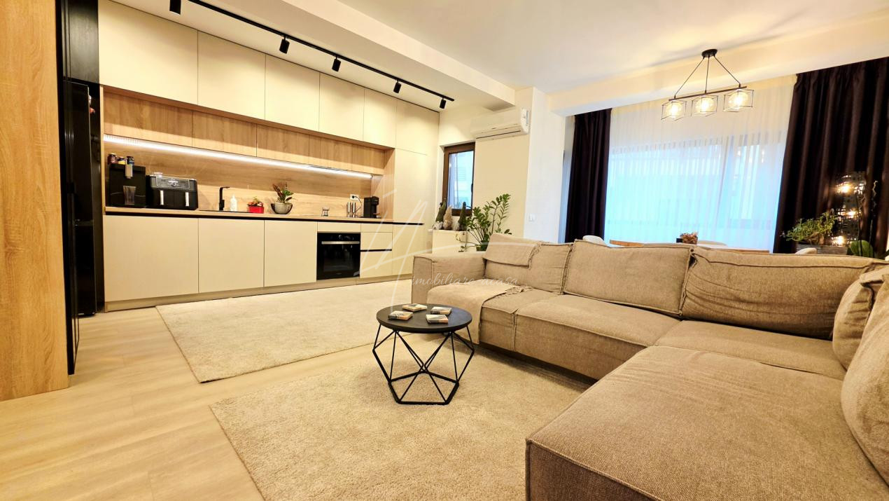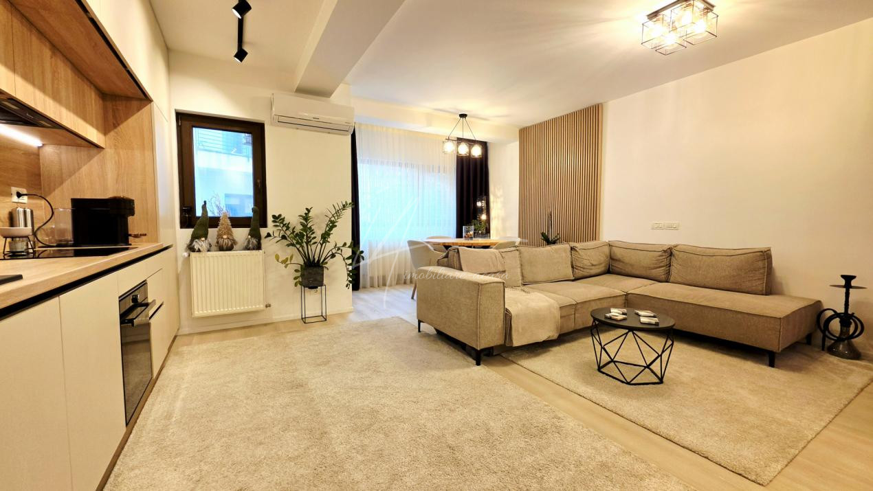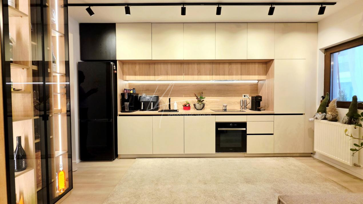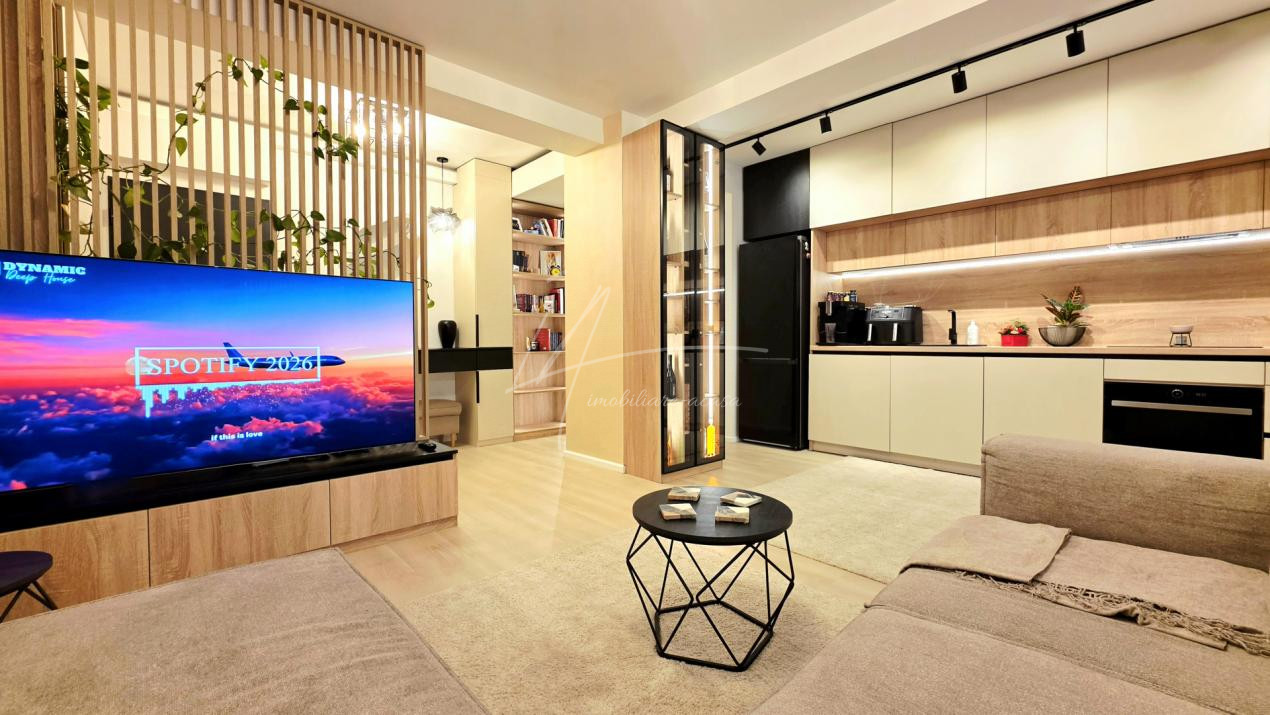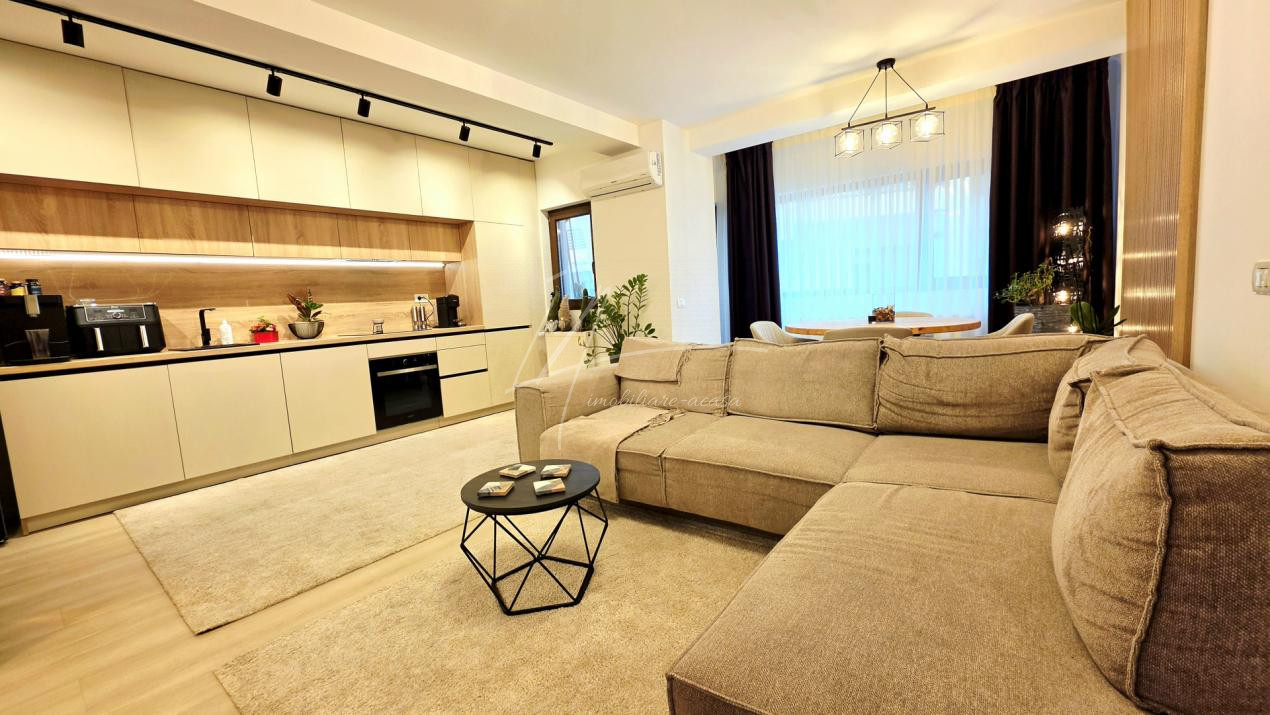 Bucataria deschisa cu livingul este mobilata si utilata cu tot ce este necesar. Livingul este minimalist si ultramodern si, odata cu canapeaua extensibila aflata in fata comodei TV, vine la "pachet" si cu o zona de "dressing" suficient de incapatoare pentru cerinta de spatiu pentru haine.