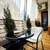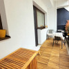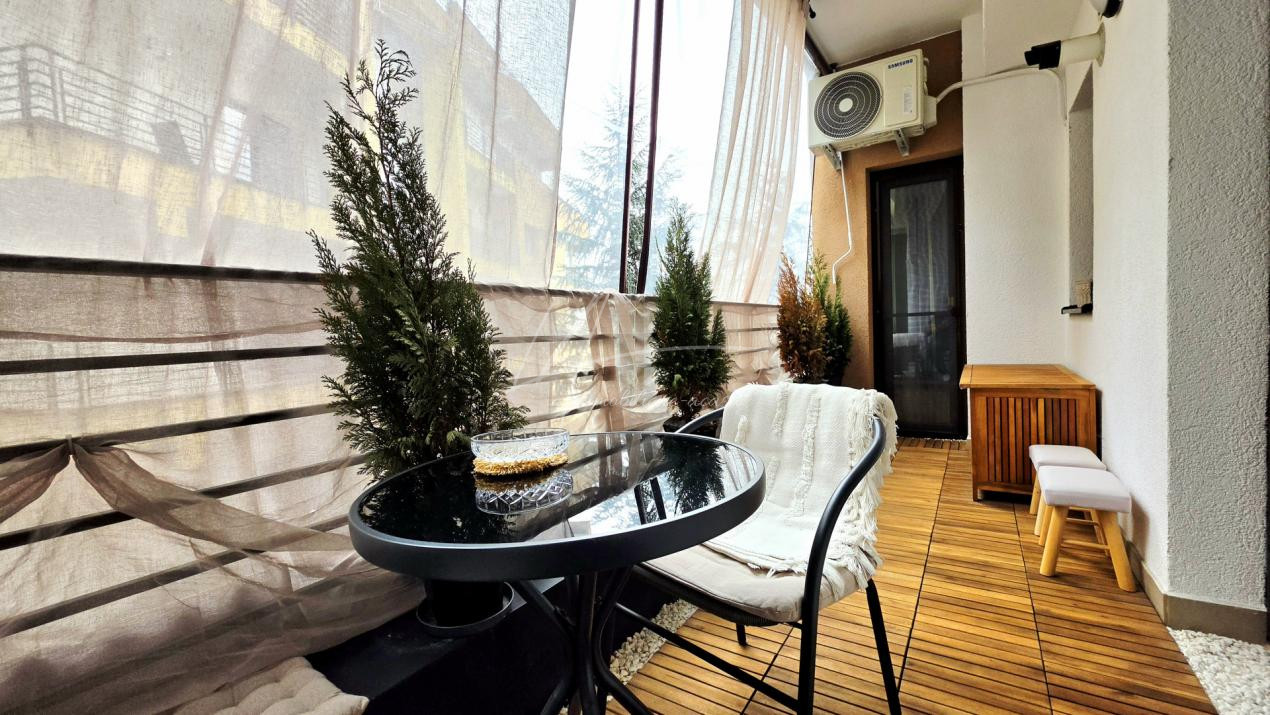 Terasa apartamentului, marginita cu balustrada de metal si jaluzele transparente pentru a te feri de vant si ploaie, ofera un plus pentru fumatori sau pentru cei care doresc sa lucreze sau sa serveasca masa in aer liber