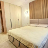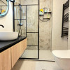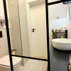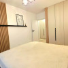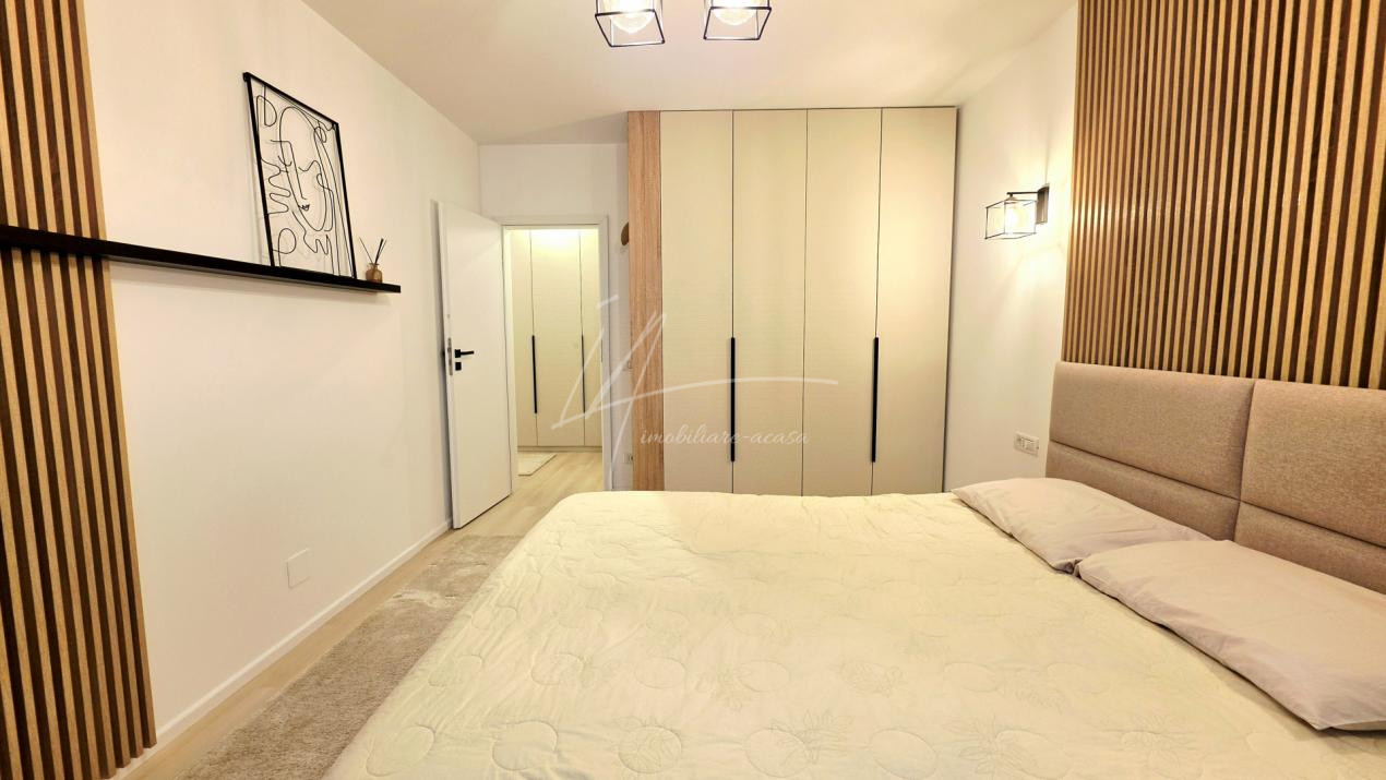 Dormitorul, de asemenea minimalist, dotat cu un pat King Size marginit de noptiere si lampi ambientale si o comoda TV se regaseste langa baia cu cabina walk-in si aerisire.