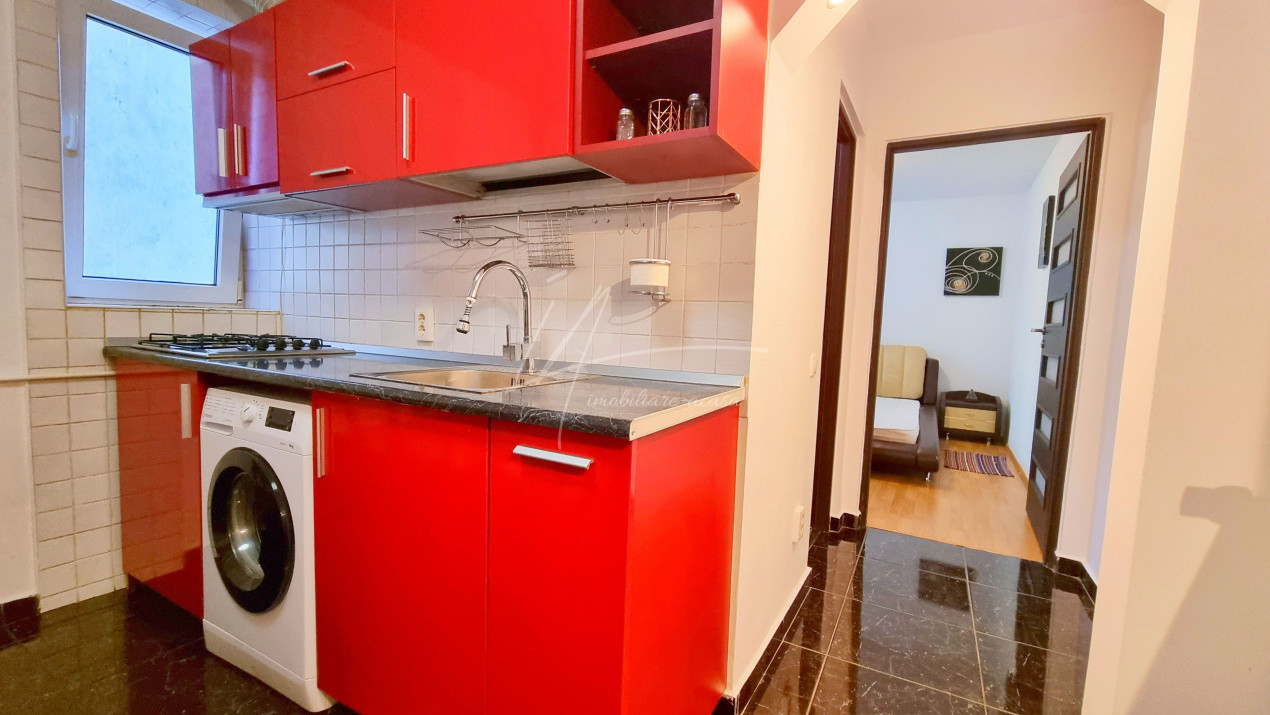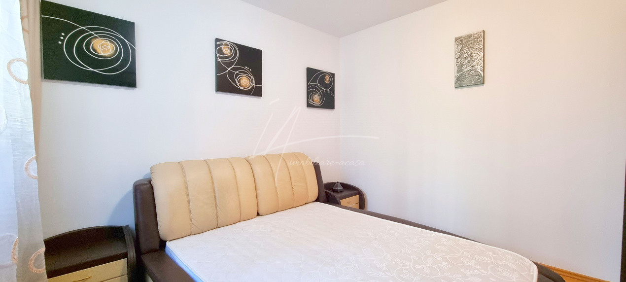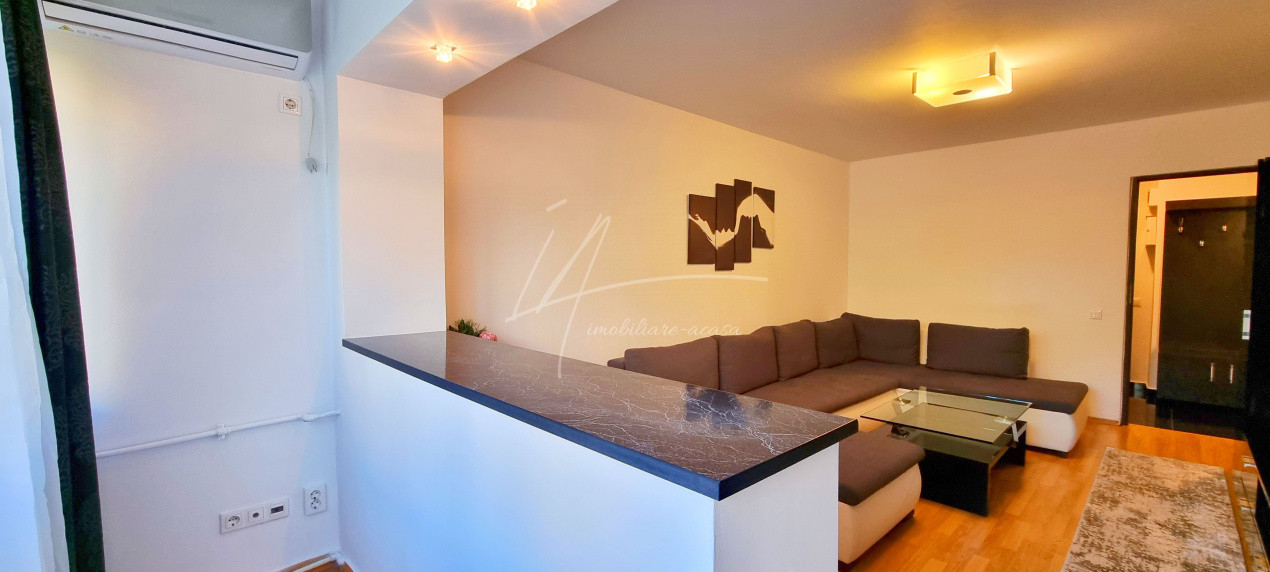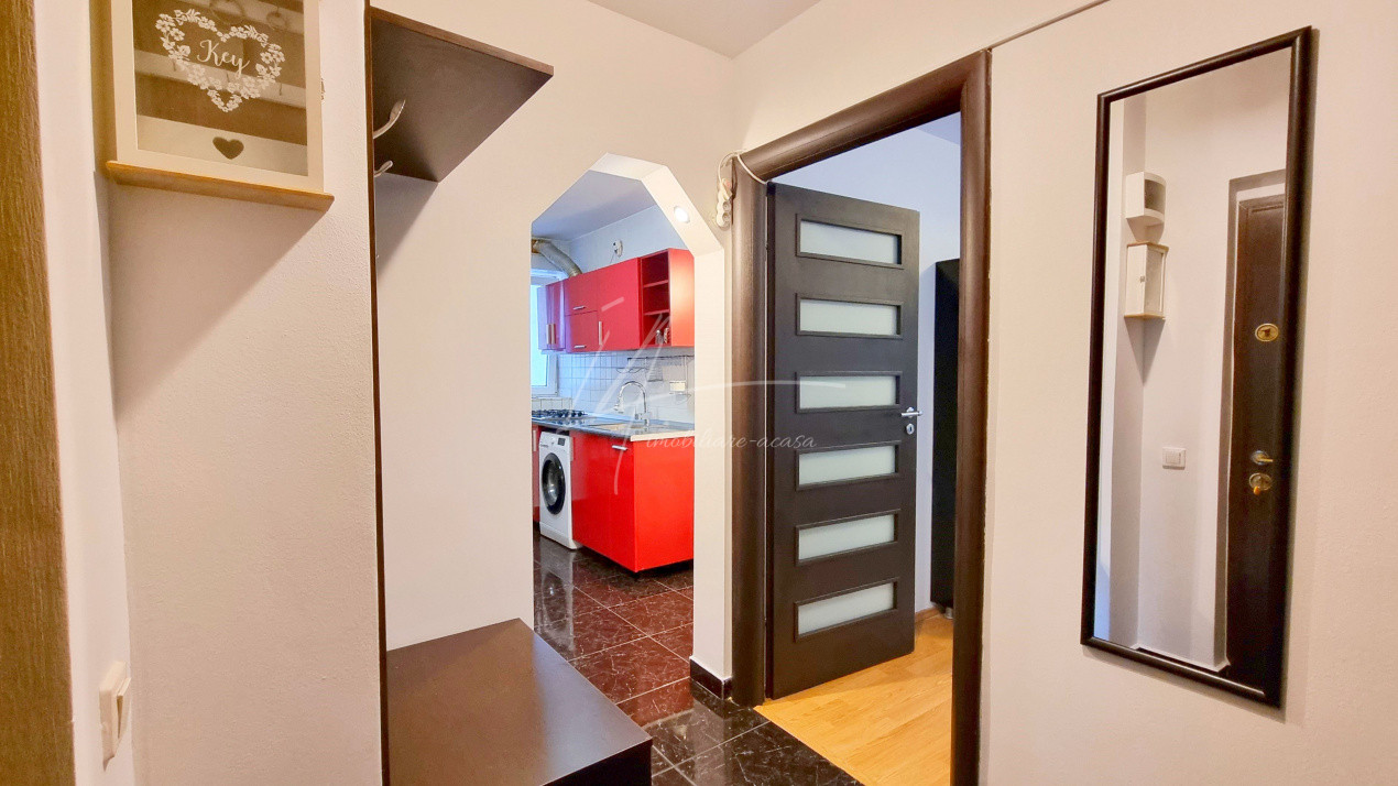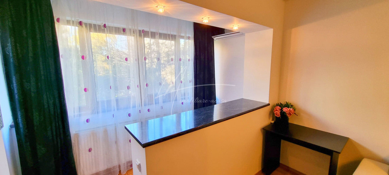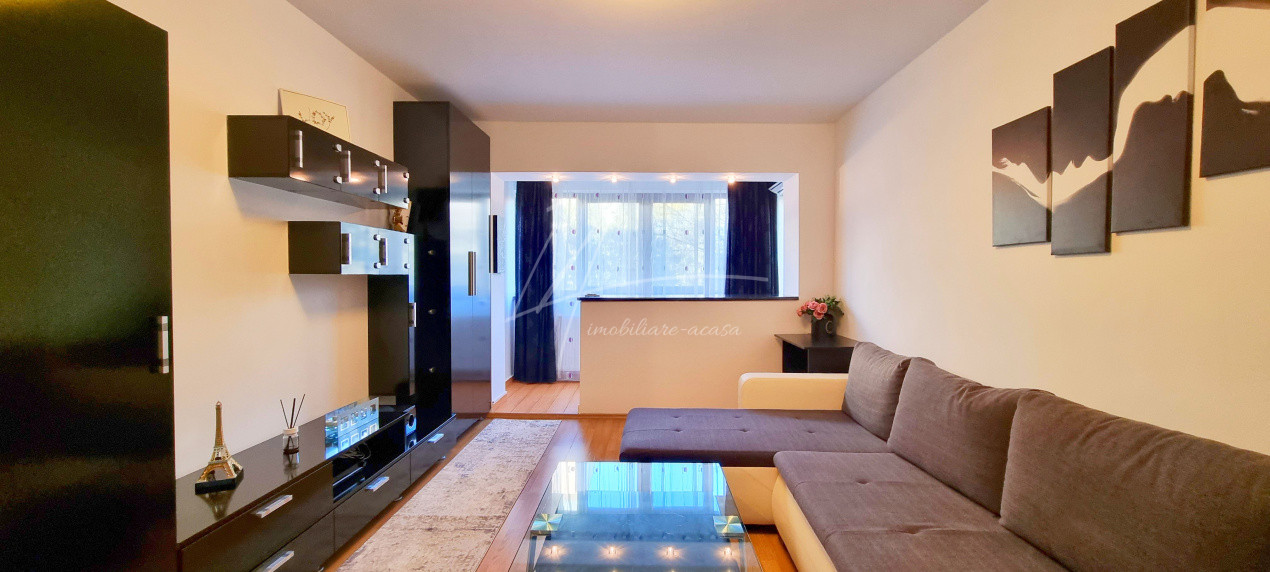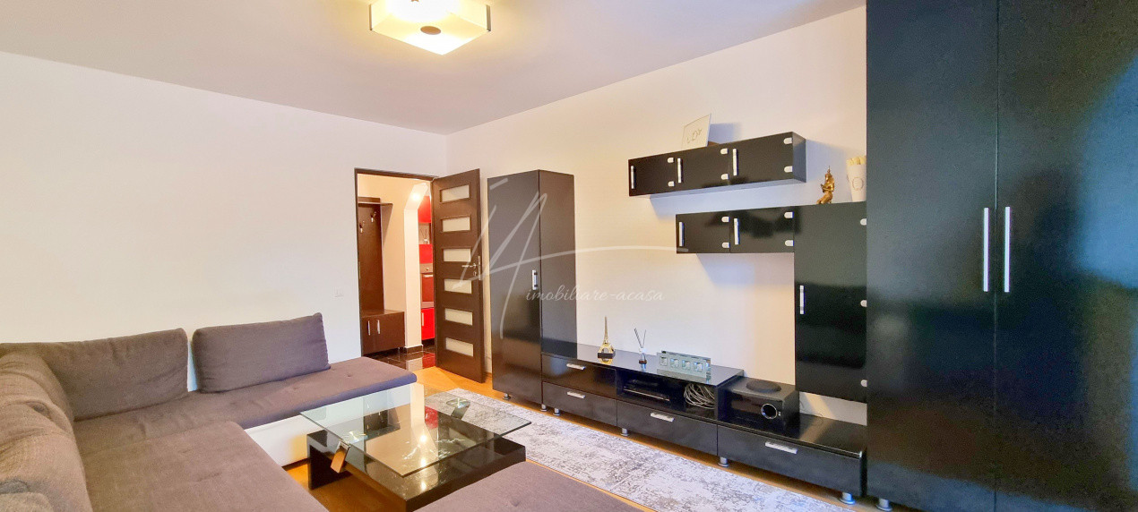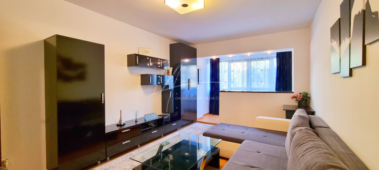Din holul principal al apartamentului se face accesul catre camera de zi, care este complet mobilata si utilata, incapatoare si luminoasa, cu o suprafata de 16,54 mp ce face legatura mai departe cu logia apartamentului, ce a fost inchisa pentru un plus de spatiu util adus apartamentului. Tot din holul principal se face legatura cu bucataria, care este complet mobilata si utilata cu plita pe gaz, cuptor electric, frigider, hota si o masina de spalat rufe. In continuarea apartamentului se afla dormitorul primitor, complet mobilat si baia, ce are geam si aerisire naturala.