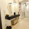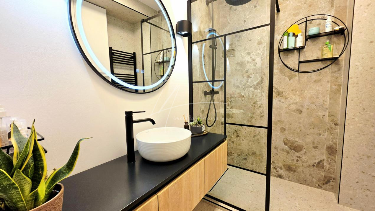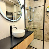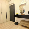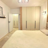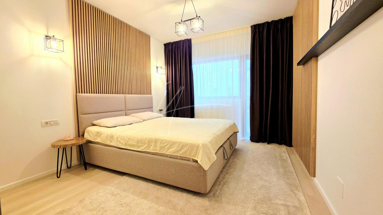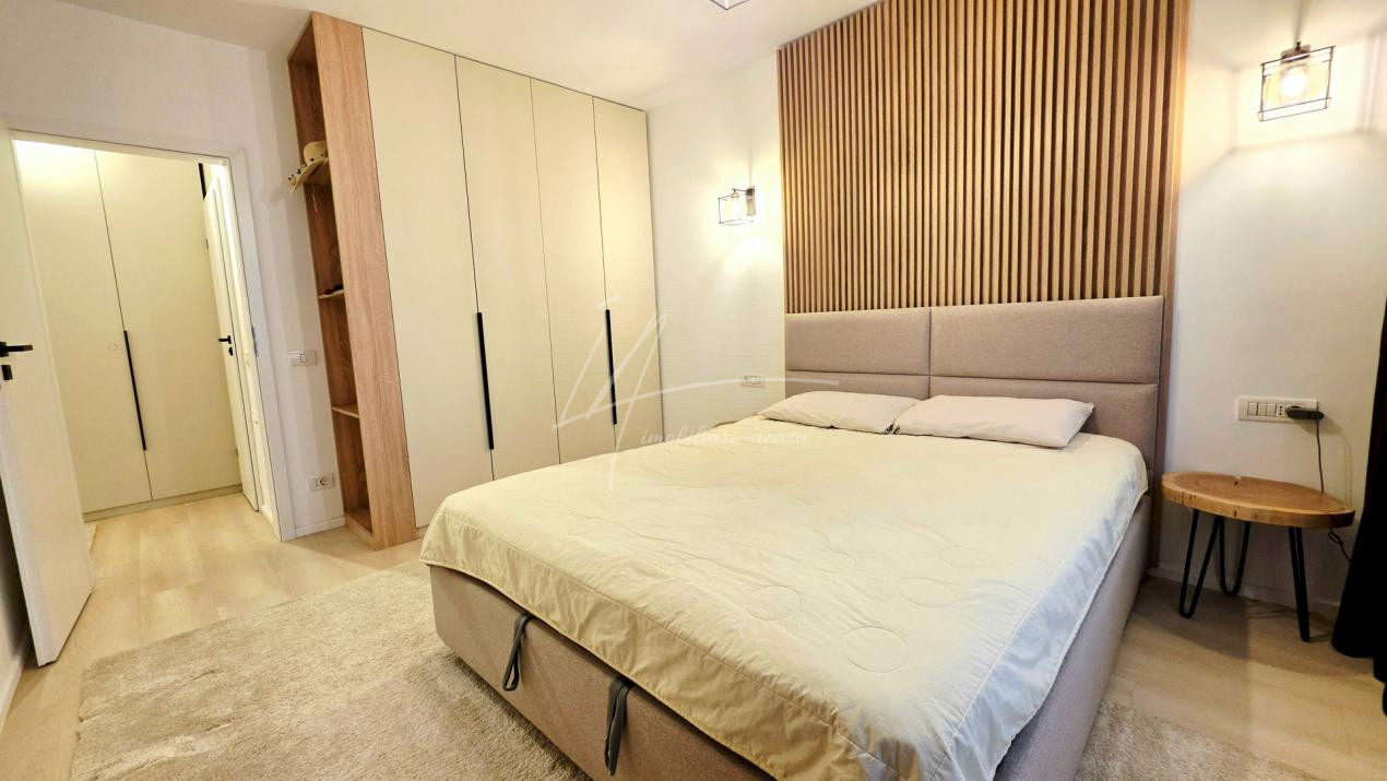 Dormitorul, de asemenea minimalist, dotat cu un pat King Size marginit de noptiere si lampi ambientale si o comoda TV se regaseste langa baia cu cabina walk-in si aerisire.
