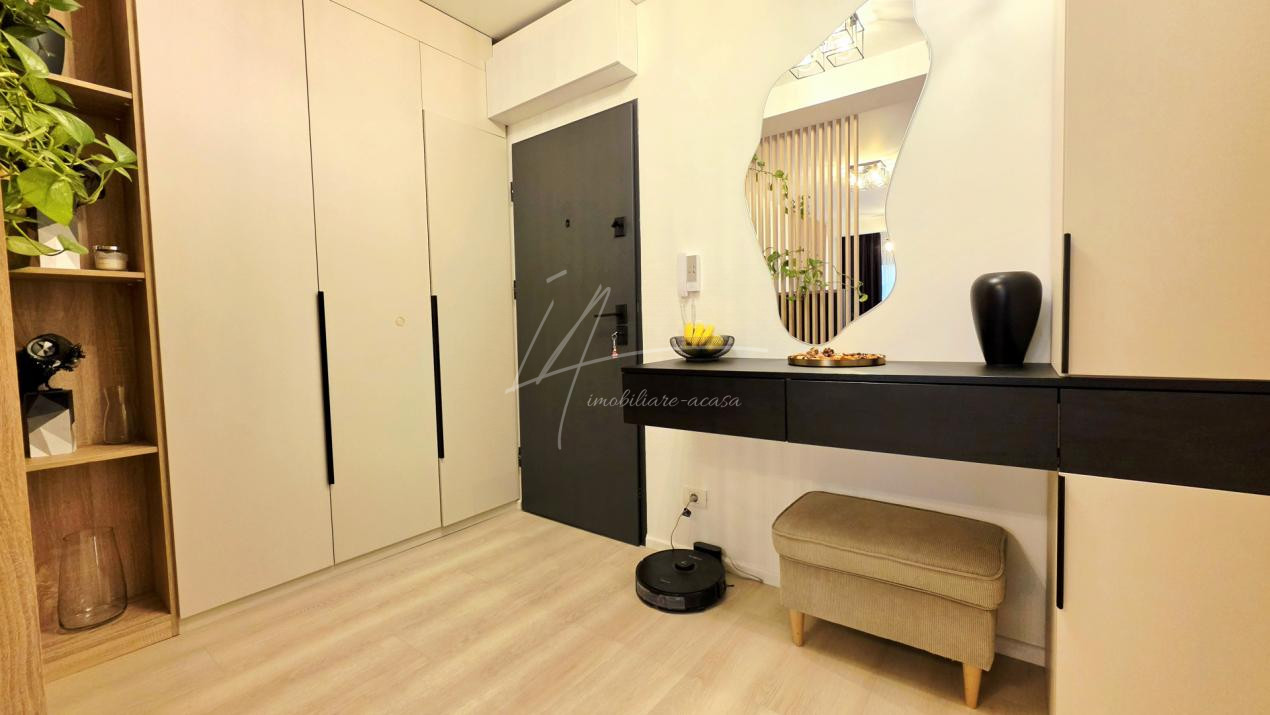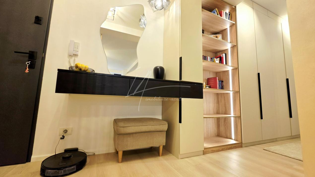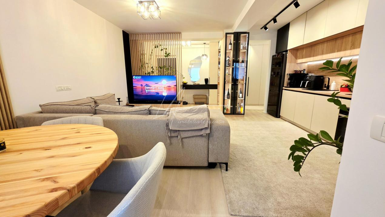 Bucataria deschisa cu livingul este mobilata si utilata cu tot ce este necesar. Livingul este minimalist si ultramodern si, odata cu canapeaua extensibila aflata in fata comodei TV, vine la "pachet" si cu o zona de "dressing" suficient de incapatoare pentru cerinta de spatiu pentru haine.