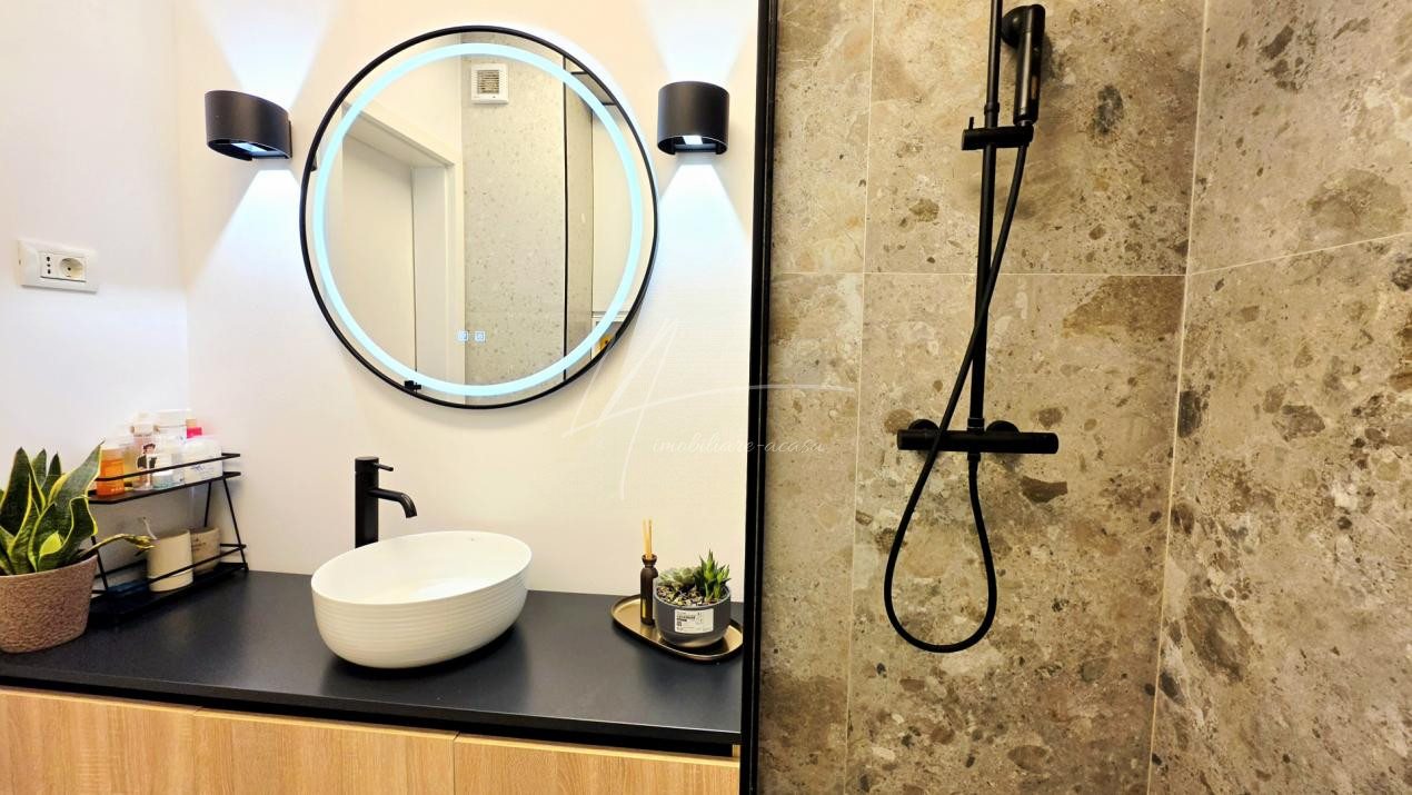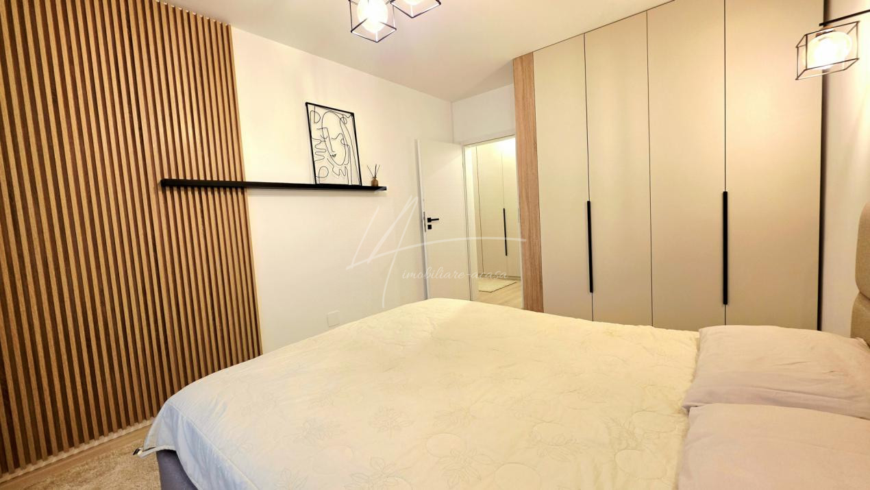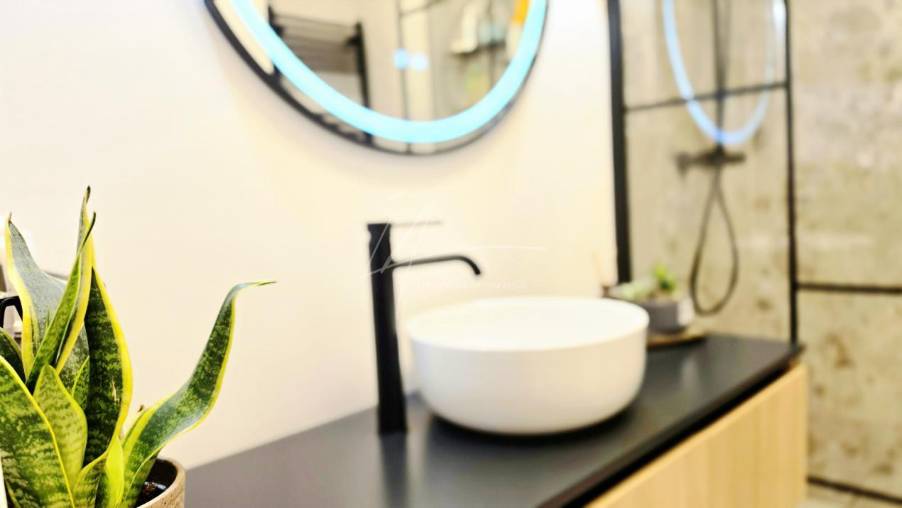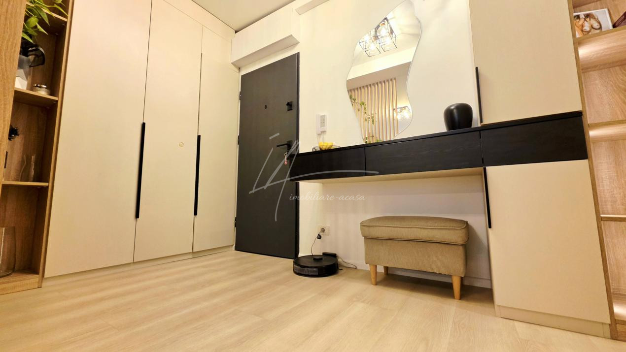Bucataria deschisa cu livingul este mobilata si utilata cu tot ce este necesar. Livingul este minimalist si ultramodern si, odata cu canapeaua extensibila aflata in fata comodei TV, vine la "pachet" si cu o zona de "dressing" suficient de incapatoare pentru cerinta de spatiu pentru haine.