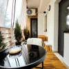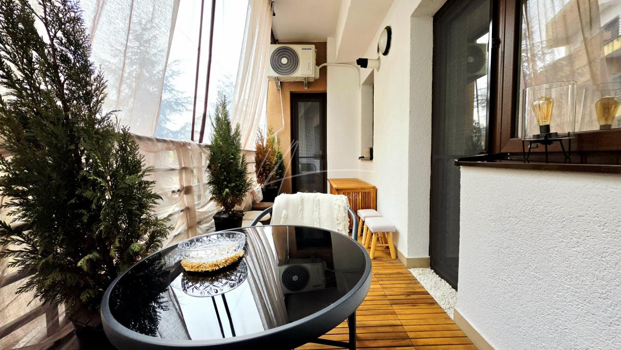 Terasa apartamentului, marginita cu balustrada de metal si jaluzele transparente pentru a te feri de vant si ploaie, ofera un plus pentru fumatori sau pentru cei care doresc sa lucreze sau sa serveasca masa in aer liber.
