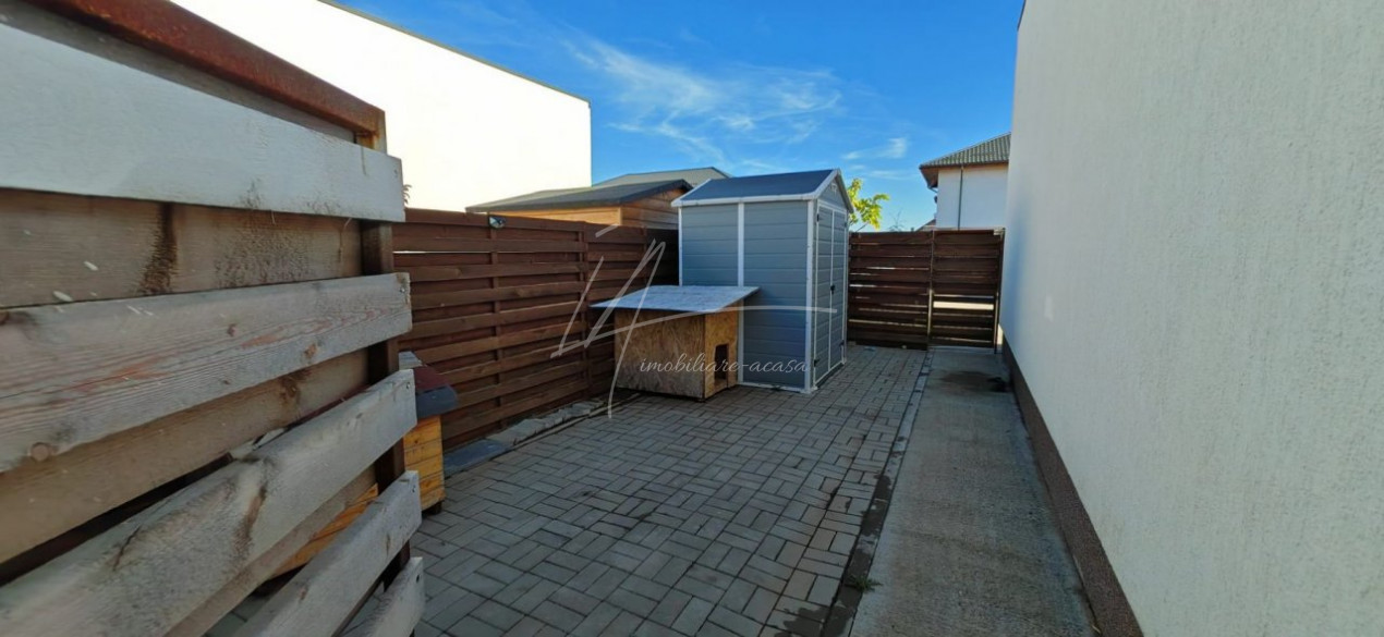 Are parcare pentru 3 masini. In curtea din spatele casei este spatiu pentru gratar, perfect pentru a ne petrece timpul liber cu familia si prietenii. In curtea laterala este o magazie pentru depozitare, are masina electrica de tuns gazon si aparat de spalat cu apa rece sub presiune Karcher.
