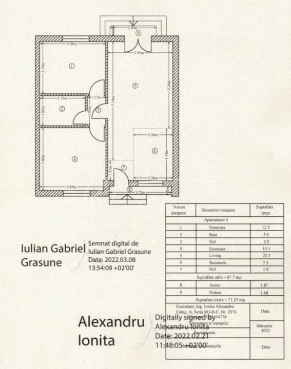 Casa cu 3 camere, cu amprenta de 79,05 mp, este total mobilată și utilată, echipată cu centrală termică proprie și aparate de aer condiționat.