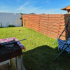 Livingul este mobilat cu canapea coltar, televizor cu comoda, cu acces spre curtea din spatele casei.