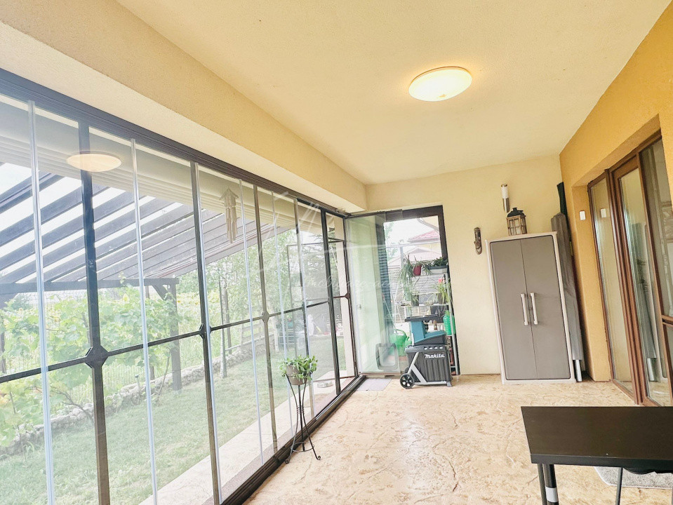 Exteriorul este la fel de impresionant: o curte amenajată superb, cu foișor, gazon, pivniță și o mini-livadă cu pomi fructiferi pe rod.