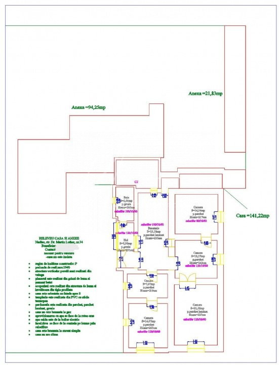 Suprafata terenului este de 812 mp, din care cladirea principala 141 mp, anexe 117 mp, curte 89 mp si gradina 465 mp.
