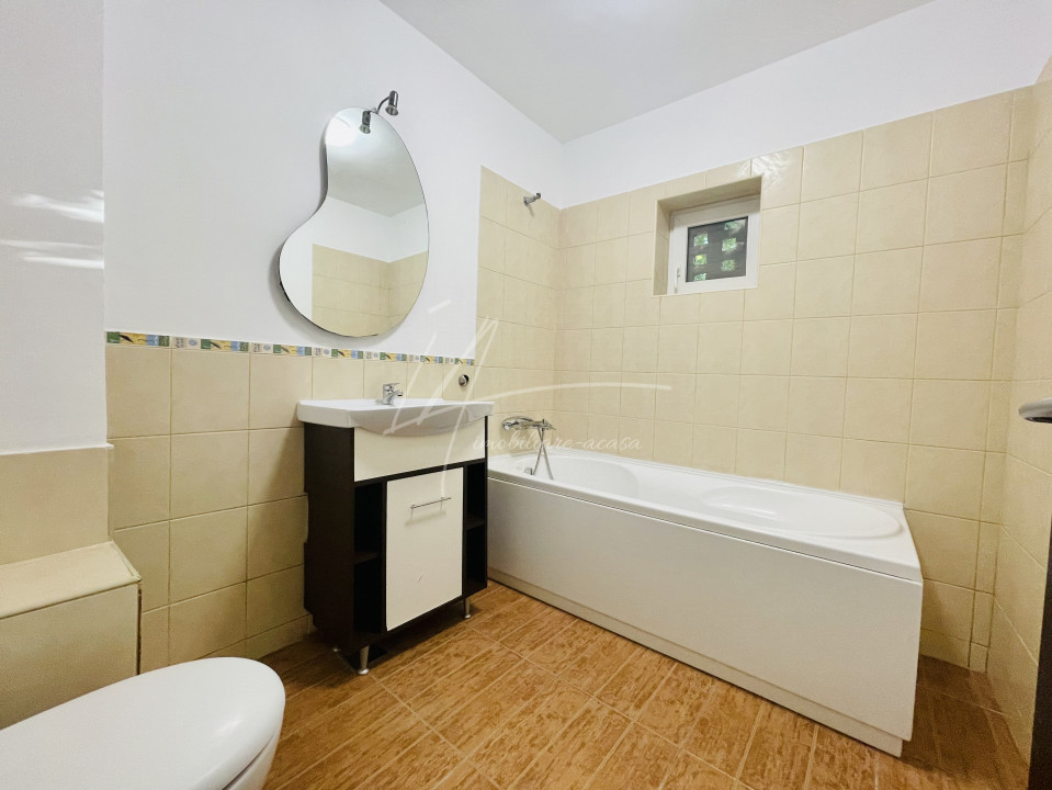 Baia, in aceleasi nuante, beneficiaza de cada si geam iar langa, pe hol, exista spatiul de depozitare pentru masina de spalat si obiecte de curatenie.