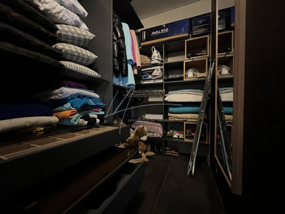 Tot pe etajul 5 regasim un living room generos cu o bucatarie open space si un loc de servit masa aferent, un dormitor matrimonial cu baie proprie si balcon, dormitor pentru copii cu baie proprie, hol de acces cu grup sanitar pentru musafiri, 2 balcoane, hol de acces si trepte catre etajul 6 unde regasim un birou, spalatorie, dressing, spatii de depozitare si accesul catre terasa imensa de 195 mp.
